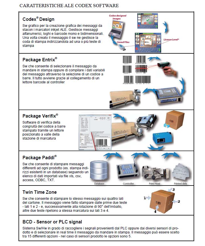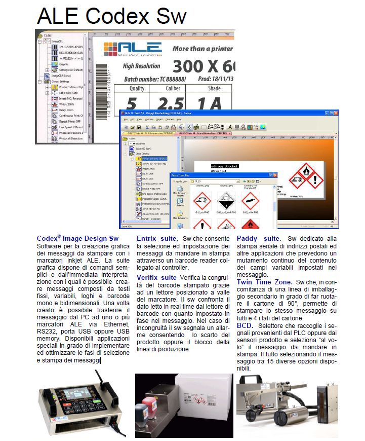 Software per la creazione grafica dei messaggi da stampare con i marcatori inkjet ALE. La suite grafica dispone di comandi semplicie dall’immediata interpretazione con i quali è possibile creare messaggi composti da testifissi, variabili, loghi e barcodemono e bidimensionali. Una volta creato è possibile trasferire il messaggio dal PC ad uno o più marcatori ALE via Ethernet,RS232, porta USB oppure USBmemory. Disponibili applicazioni speciali in grado di implementare ed ottimizzare le fasi di selezionee stampa dei messaggi.