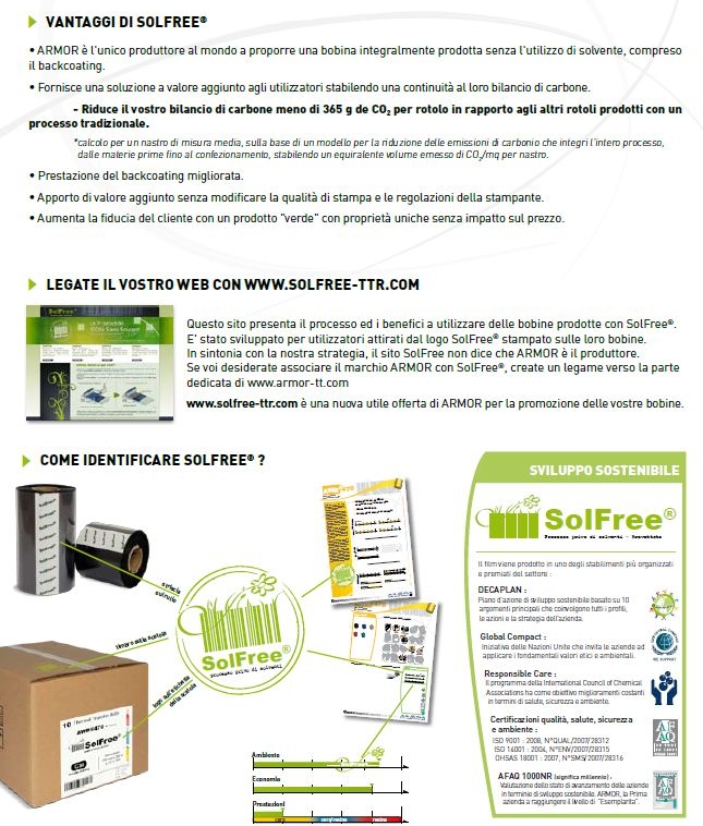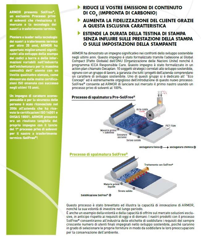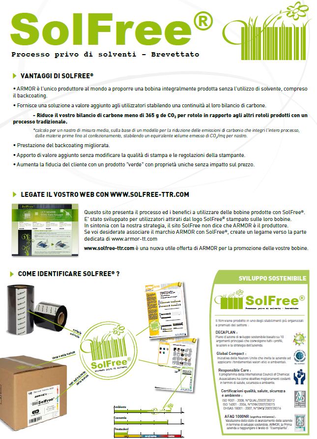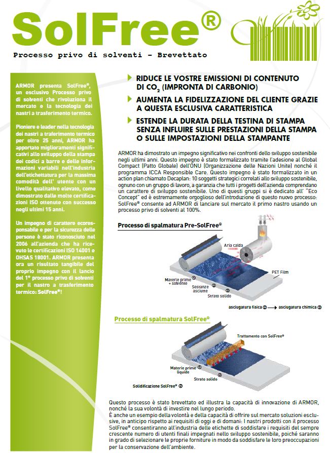 ARMOR presenta SolFree®,un esclusivo Processo privo di solventi che rivoluziona il mercato e la tecnologia dei nastri a trasferimento termico. ARMOR è l’unico produttore al mondo a proporre una bobina integralmente prodotta senza l’utilizzo di solvente, compresoil backcoating.