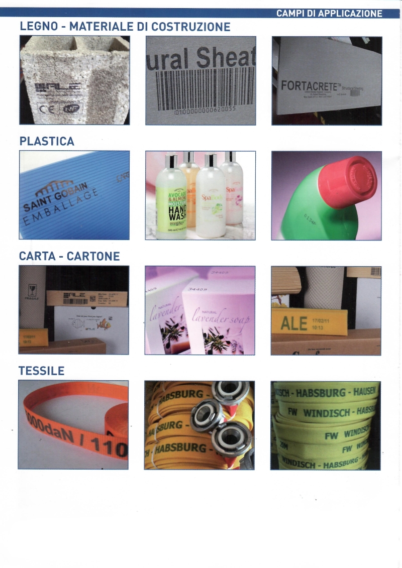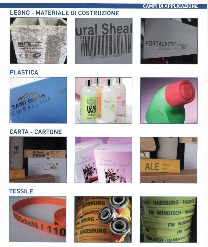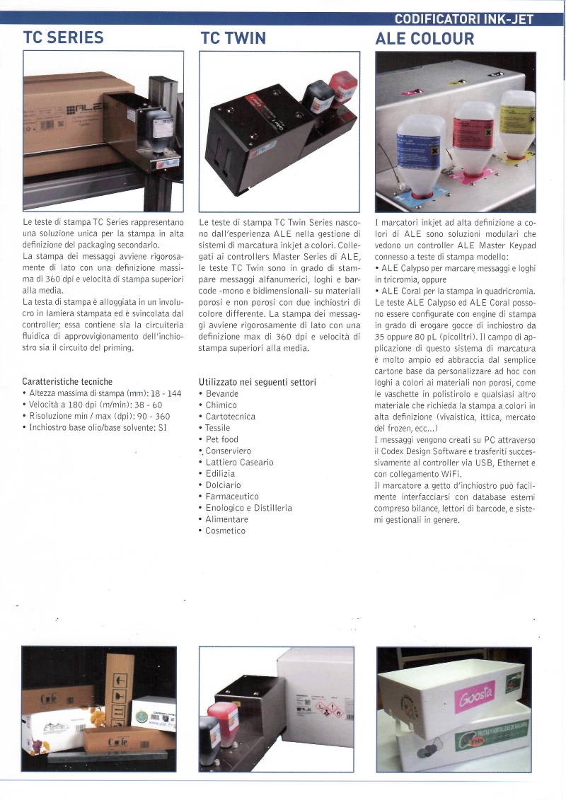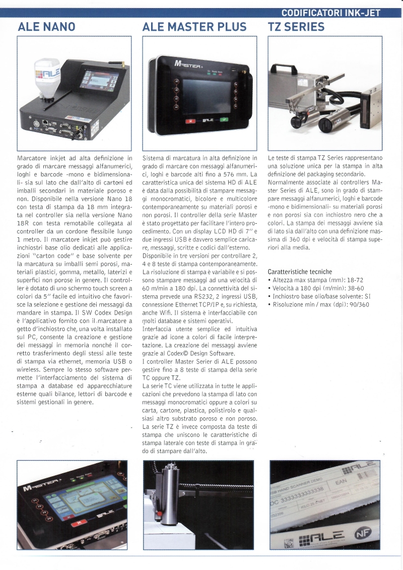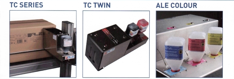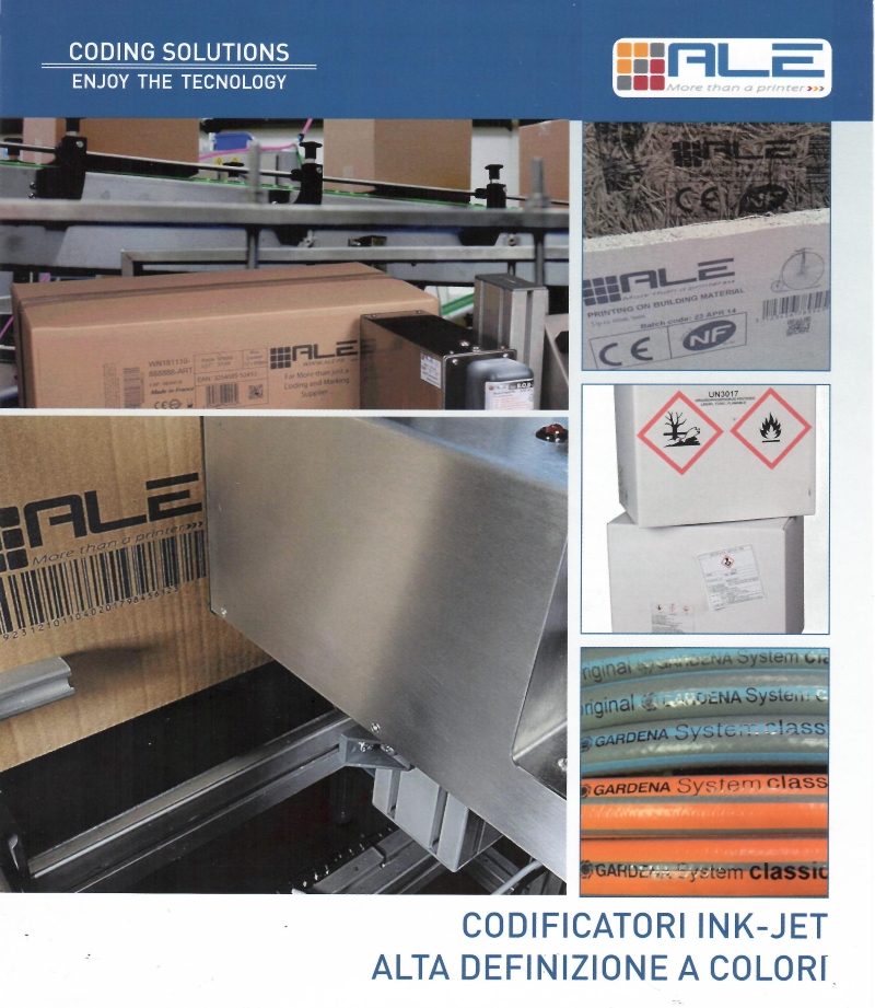 I sistemi di marcatura delle ALE sono una vasta gamma di codificatori ink-jet ad alta definizione con possibilità di stampare anche a colori, messaggi alfanumerici, loghi e barcode mono e bidimensionali (qr-code) sia sui lati che dall’alto di cartoni ed imballi in materiale porono e non poroso.