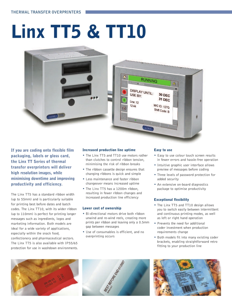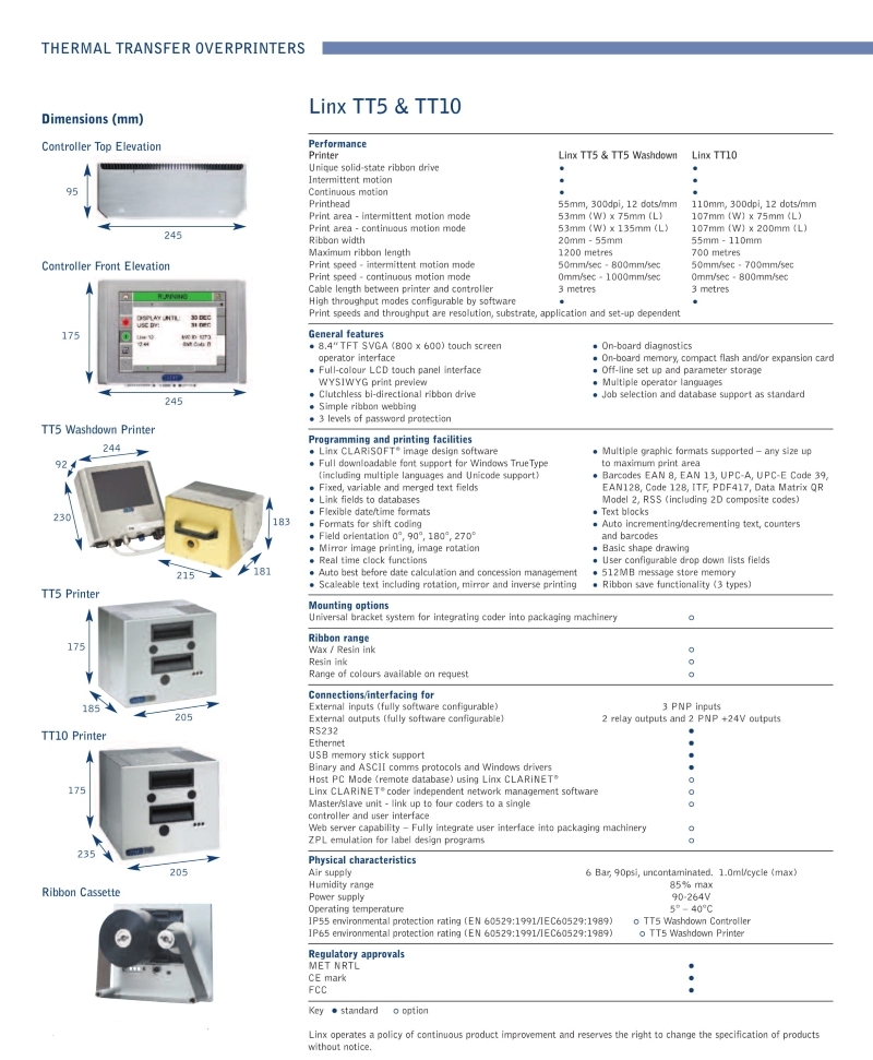 Codificatore a trasferimento termico per la personalizzazione in real time di packaging flessibile, materiali poliaccoppiati ed astucci. Disponibile in versione sinistra e destra per la personalizzazione di superfici larghe fino a 4″ (101 mm) si integra perfettamente su termoformatrici e confezionatrici automatiche sia orizzontali che verticali. La modalità di stampa in continuo o intermittente è selezionabile via sw e consente l’utilizzo del codificatore su diverse confezionatrici e sistemi di sfogliatura. Il codificatore a trasferimento termico TT10, grazie al sistema di protezione water proof, può essere installato in ambienti umidi ed ostici ove è previsto il lavaggio delle linee con acqua corrente. Anche il TT10, come i modelli più piccoli, ha un cassetto porta-nastro semplice e robusto e, grazie all’adozione di due stepper motor, ottimizza lo svolgimento del nastro garantendo ottimi risultati in termini di ribbon saver. L’ampia formato lo pone come soluzione ideale in tutti quei casi ove sia richiesta un’ampia superficie per stampare gli ingredienti, allergeni e pannelli nutrizionali nel settore alimentare dei prodotti pronti, del fresco, del frozen e nel lattiero-caseario. Altrettanto utilizzato nel comparto farmaceutico per la personalizzazione multilingua dei monodose, degli intergratori alimentari, dellebustine di composti disidratati, ecc…