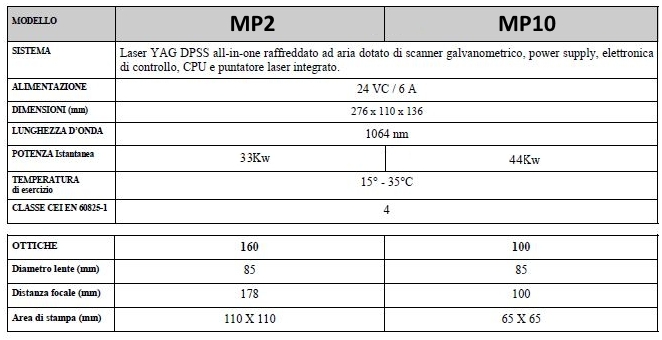 Il sistema MP2 di mpix è un marcatore laser allo stato solido pompato a diodi che racchiude all’interno di un raffinato e minuscolo involucro in lamiera stampata la più avanzata tecnologia di marcatura laser a semiconduttore. Progettato e costruito nella configurazione AIl-in-one si presta agevolmente anche per le applicazioni fuori linea e per marcature da job-shop. Il software grafico SL fornito di serie consente la facile creazione di messaggi comprensivi di codici alfanumerici,grafiche e barcode mono e bidimensionali.