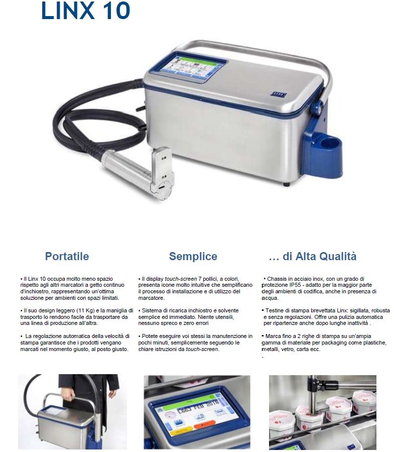 Linx 10 occupa molto meno spazio rispetto agli altri marcatori a getto continuo d’inchiostro, rappresentando un’ottima soluzione per ambienti con spazi limitati. Il suo design leggero (solo 11 Kg) e la maniglia di trasporto lo rendono facile da trasportare, anche da una linea di produzione all’altra.