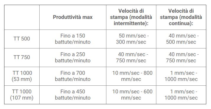 Caratteristiche della testina di stampa : TT500 32 mm, 200 DPI, 8 dots/mm. TT750 53 mm, 30 DPI, 12 dots/mm. TT1000 107 mm, 300 DPI, 12 dots/mm