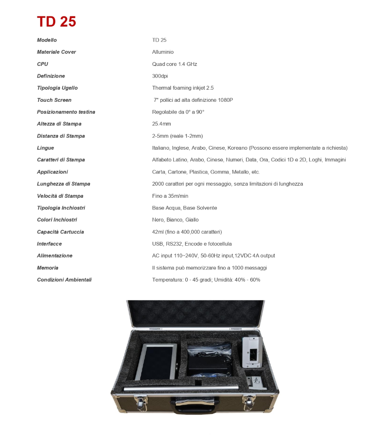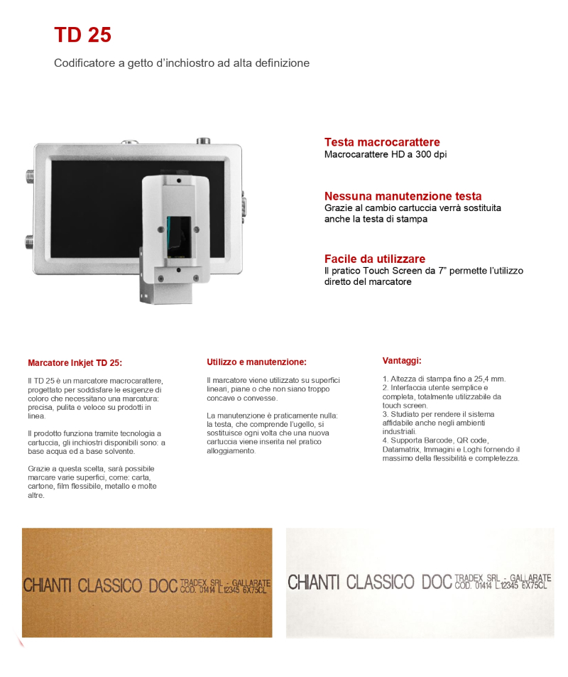 Il TD 25 è un marcatore macrocarattere, progettato per soddisfare le esigenze di coloro che necessitano una marcatura: precisa, pulita e veloce su prodotti in linea.