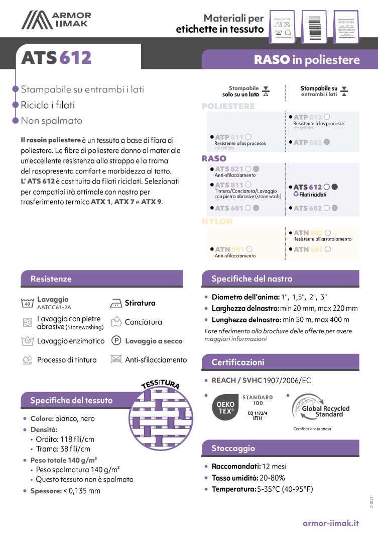 I materiali per etichette in tessuto ARMOR-IIMAK sono compatibili con i nastri a trasferimento termico ATX 1, ATX 7 e ATX 9, certificati OEKO-TEX® Standard 100 – Classe 1 CQ 1172/1 IFTH. Insieme, avrete la certezza che il risultato di stampa soddisferà le vostre aspettative.